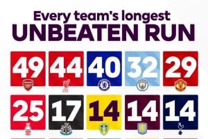 英超官方盘点了联赛中每支球队目前的最长不败纪录,并发问:“你觉得阿森纳的纪录会有被打破的那一天吗?”
